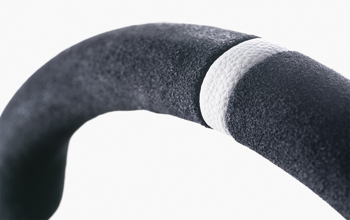 El volante está fabricado en aluminio cepillado y anodizado y recubierta de genuino Alcantara®. Cuenta con una franja central de cuero blanco y costuras cruzadas blancas.
