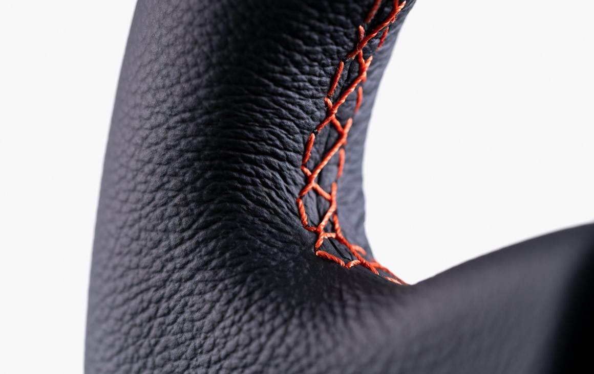 El volante está realizado en aluminio cepillado y anodizado y revestida de auténtica piel lisa. El esquema de color inspirado en las carreras utiliza una franja central azul y costuras naranjas.