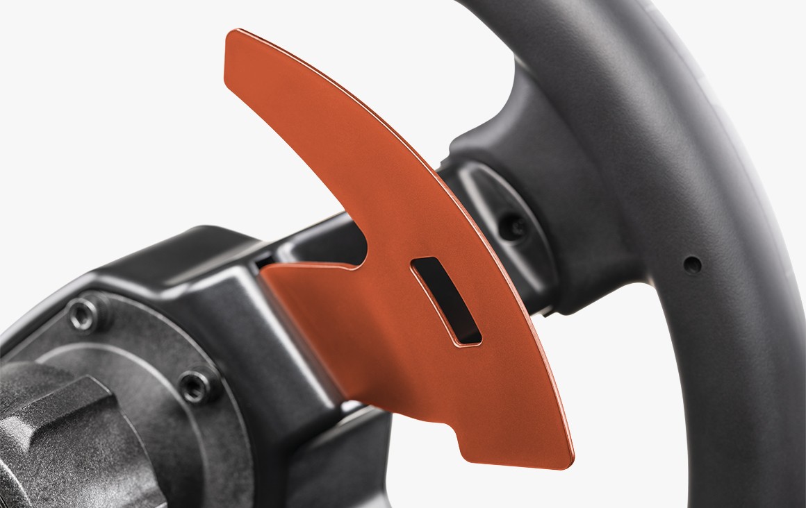 Los 12 botones en la parte frontal de la rueda están ubicados de manera que le permiten encontrar la entrada correcta por sensación y memoria muscular. Las levas de la palanca de cambios de metal color cobre están asistidas por un domo a presión para una sensación positiva de “clic”.