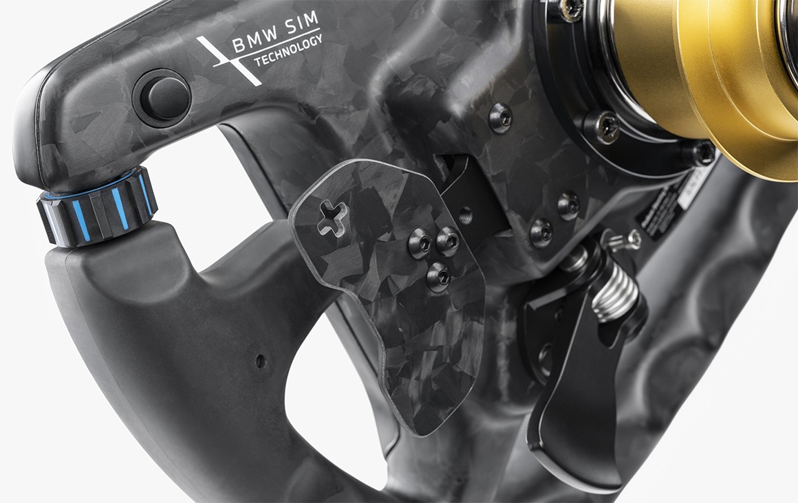 El volante del M4 GT3 está repleto de características, algunas de las cuales no son obvias a primera vista, como palancas de cambio magnéticas de doble acción, paletas de embrague analógicas dobles con recorrido ajustable, dos botones adicionales montados en la parte trasera y el D-pad oculto debajo, el logotipo de BMW.