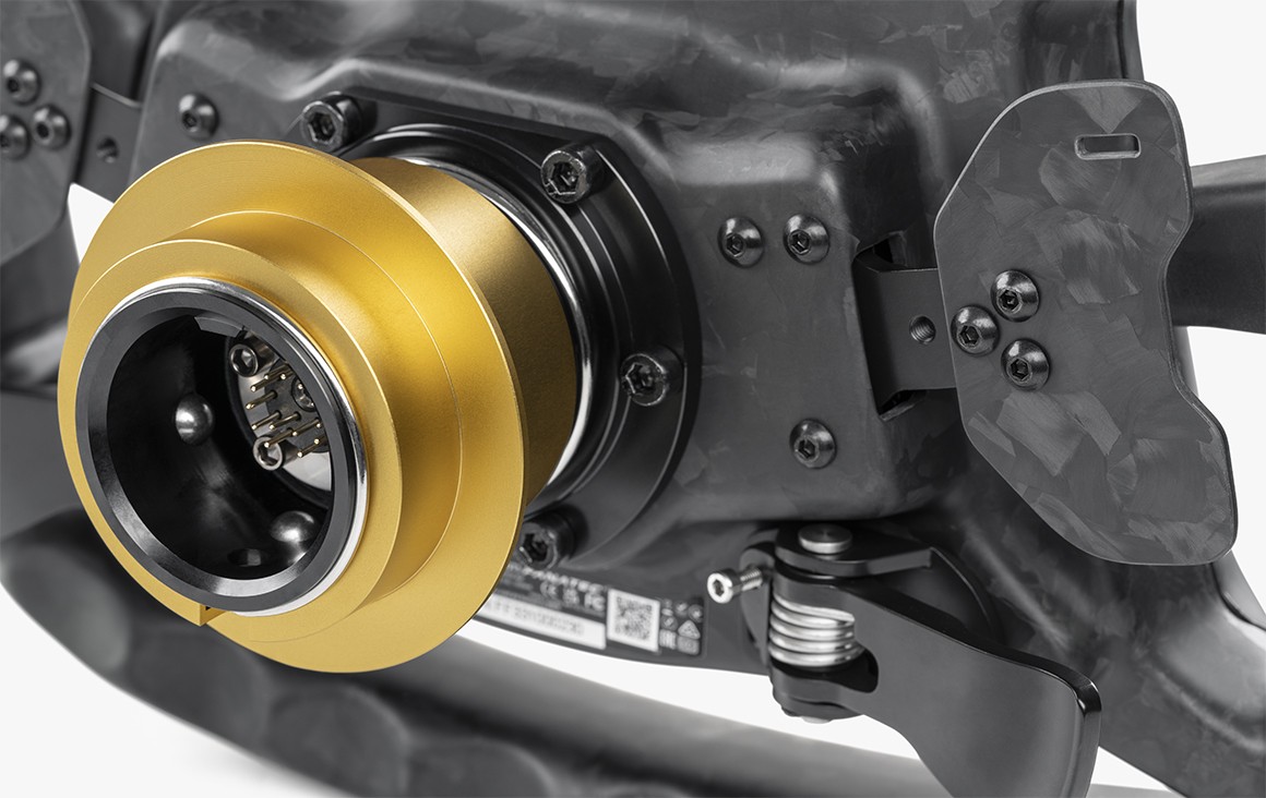 El volante Podium M4 GT3 First Edition está preinstalado con un cierre rápido “QR1 Wheel-Side” de aluminio anodizado dorado. El ‘QR2 Wheel-Side’ también está incluido.