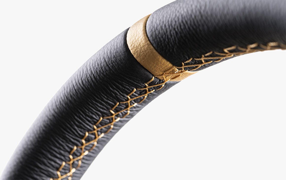 La Podium Wheel Rim R300 está fabricada en aluminio cepillado y anodizado y está cubierta con cuero liso de primera calidad y costuras doradas. Se incluyen tornillos de aluminio anodizado dorado.